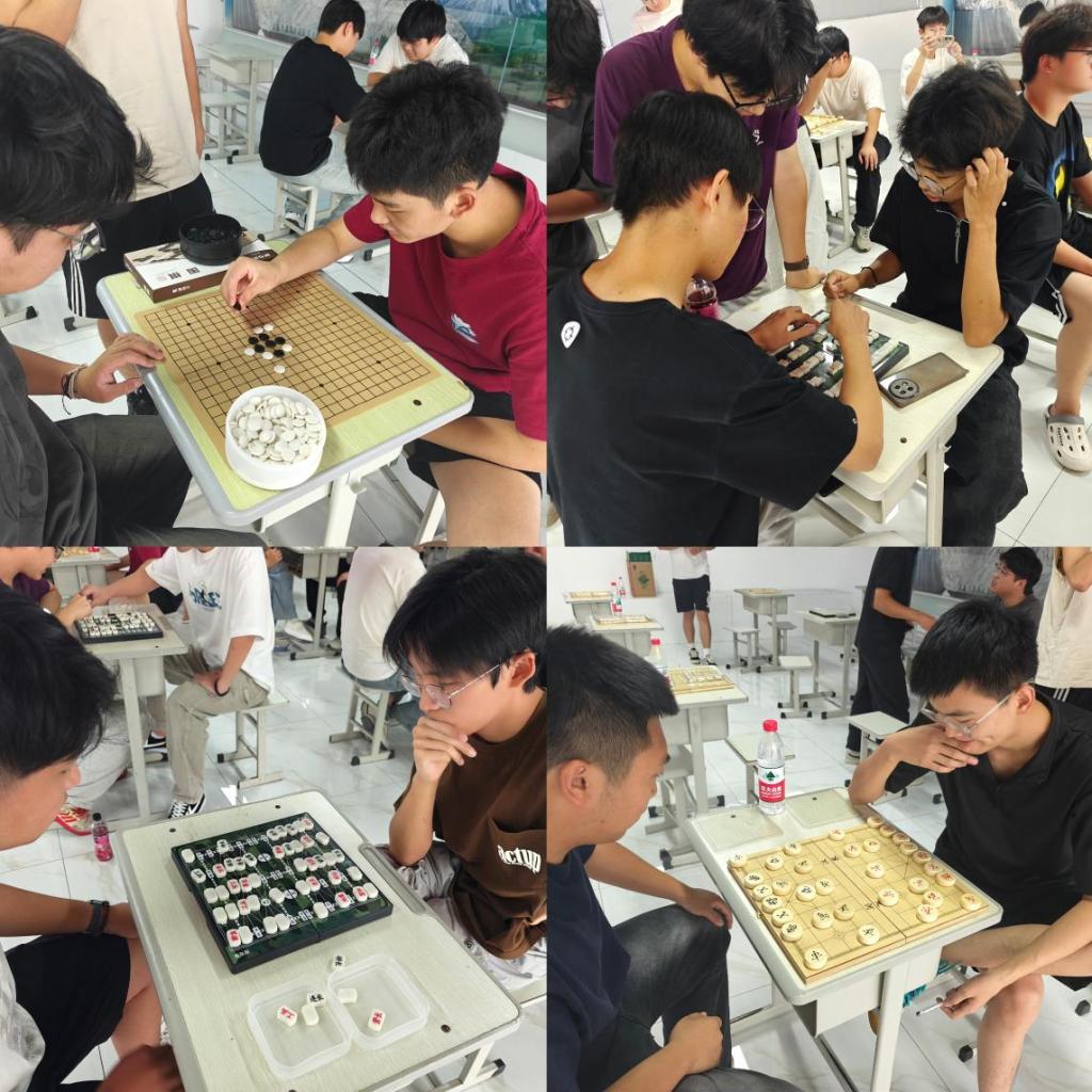 比赛现场,选手们专注于棋局博弈:五子棋区,选手们紧盯棋盘,轮流落子,争夺连成五子的先机;象棋区,双方在“楚河汉界”两侧排兵布阵,马、炮、车等棋子按规则移动,展开攻防;军棋区的同学们谨慎翻棋、吃子,策略性更强。
