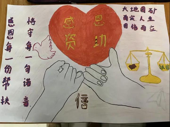 作品说明:作品中间由“感恩资助”字样的红色爱心和拉钩的手组成,象征善意和感恩,两手联结表达相互信任,图片右侧有“书本”和“诚信的天平”,提醒学子们在勇于追梦的途中不要忘记初心,人生因“信”而立,希望学子们能信守承诺,怀揣感恩之心。