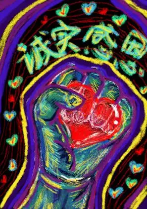 作品说明:拳头象征诚信——代表力量、坚守与担当。其硬朗线条与深冷色调,勾勒出人格坚实的外壳。心脏象征感恩——代表生命、温度与真挚。其鲜红色彩与炽热光芒,象征着内心最柔软珍贵的情感内核。最关键的理念在于守护关系:诚信并非冰冷坚壳,而是主动选择以坚定姿态,温柔守护内心那抹柔软。光芒从指缝中迸发,寓意在诚信的守护下,感恩之心得以安全而耀眼地绽放。